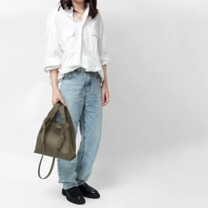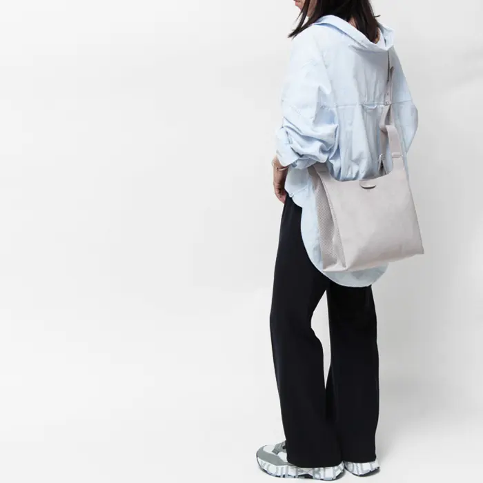 肩がけや斜め掛けで持つのはもちろん、ギボシでストラップを外せば、ハンドル持ちもできる2way仕様です。アクティブに行動したい日に大活躍のバッグ。