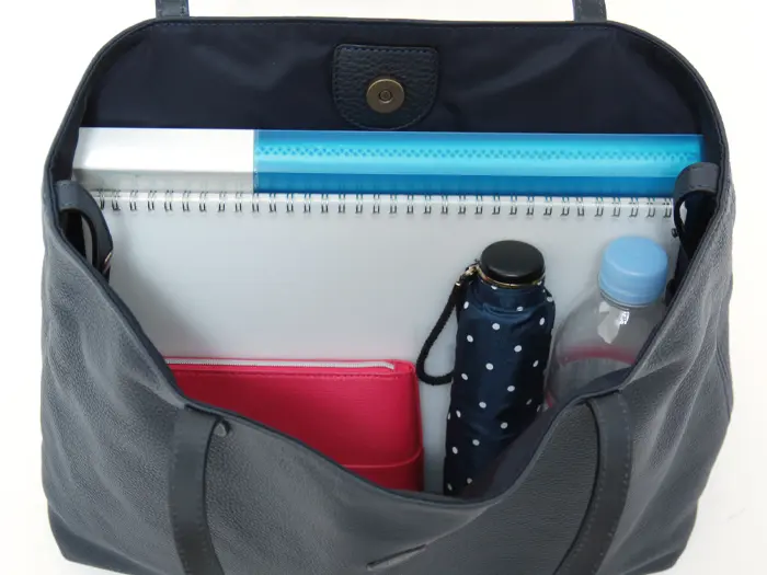 ワンタッチで開閉が可能なマグネット使用。A4サイズが綺麗に収まり、マチがあるので必需品の他にもペットボトルや折りたたみ傘が入るサイズ感です。 背面内側には大きめのファスナーポケットが1つあり、小物やメモ帳などの整理も◎