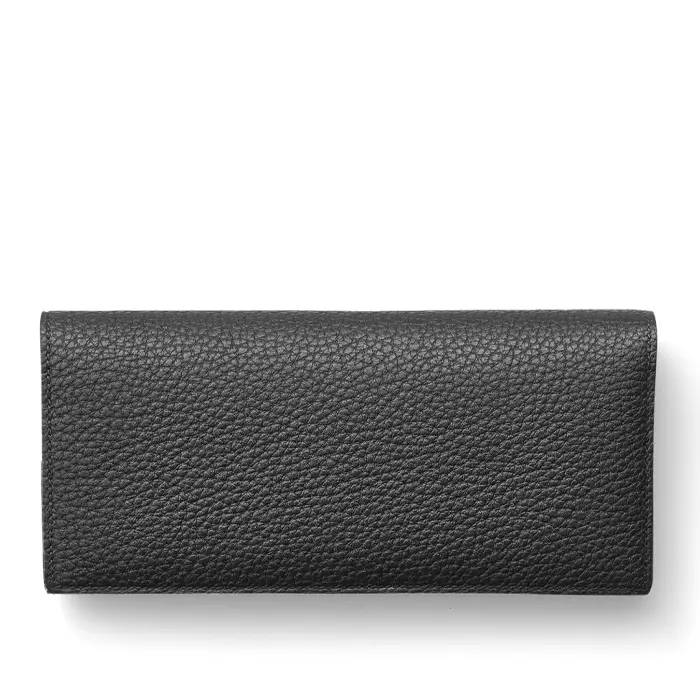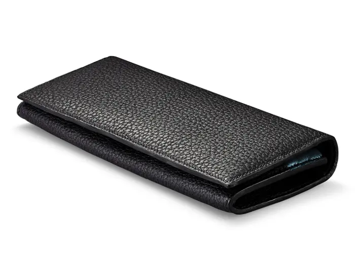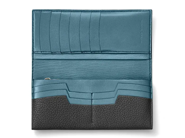 お札収納が小銭入れで仕切られ、1ヶ所はササマチ付き。カード収納は手前に6ヶ所とフラップ裏に7ヶ所、計13ヶ所あります。フラップ裏にはフリーポケットも2つあり、領収書などが整理できます。見た目はすっきりと、収納が充実した使いやすいデザインとなっています。