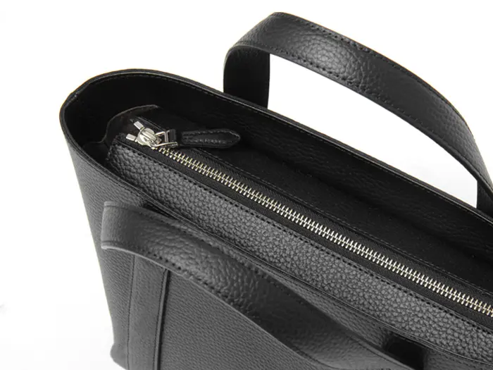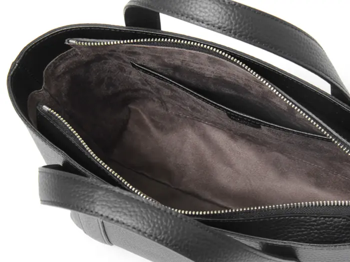 開口部はファスナー開閉仕様で、中を閉じることでカジュアル感を抑えた上品な仕上がりです。また、開閉部分をしっかり閉じられるため、人混みでも安心して持ち運べます。