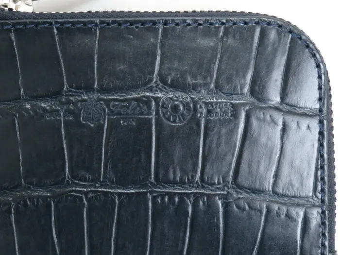 使用している本革はフェリージオリジナルのクロコダイル型押しエンボスレザー。ベジタブルタンニンで鞣された後に特殊な工程で色づけするため、発色が美しく、ほんのり光沢があり、上品で高級感があります。男女問わずお使いいただける折財布は、自分へのご褒美や大切な方へのプレゼントにもおすすめです。