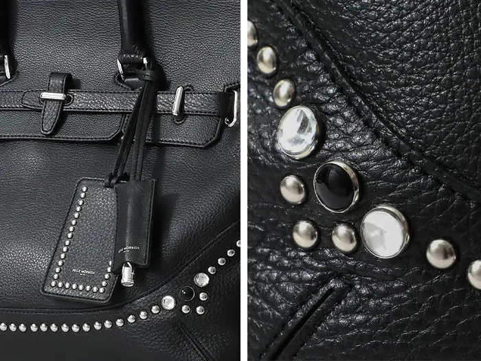 モルビダで定番のやわらかなシュリンクレザーを使用。自立する設計と革の柔らかさを楽しめる素材で、曲線的なフォルムが艶やかな色気を演出。スーパーホワイト加工によって輝く金具とラグジュアリーなスタッズがアクセントになっています。