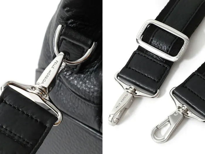 開閉はかぶせベルト式の3本のベルトで行います。正面のベルトを止めている金具は上が空いていて、外しやすくなっています。また、サイドのベルトは外したまま崩して持つのもお洒落です。