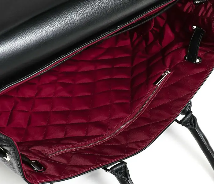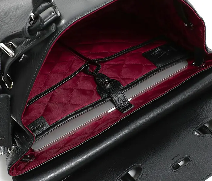 内装にはライダースの裏地をイメージしボルドーのキルティング素材を使用。A4サイズがゆったり収まる大きさで、マチ幅も広く荷物がたっぷり入ります。コンパートメントされたポケットやペン差しなど、スッキリスマートに収納できる内装。ポケットにはウレタンが入っているのでスマホなどを入れるのにも便利です。