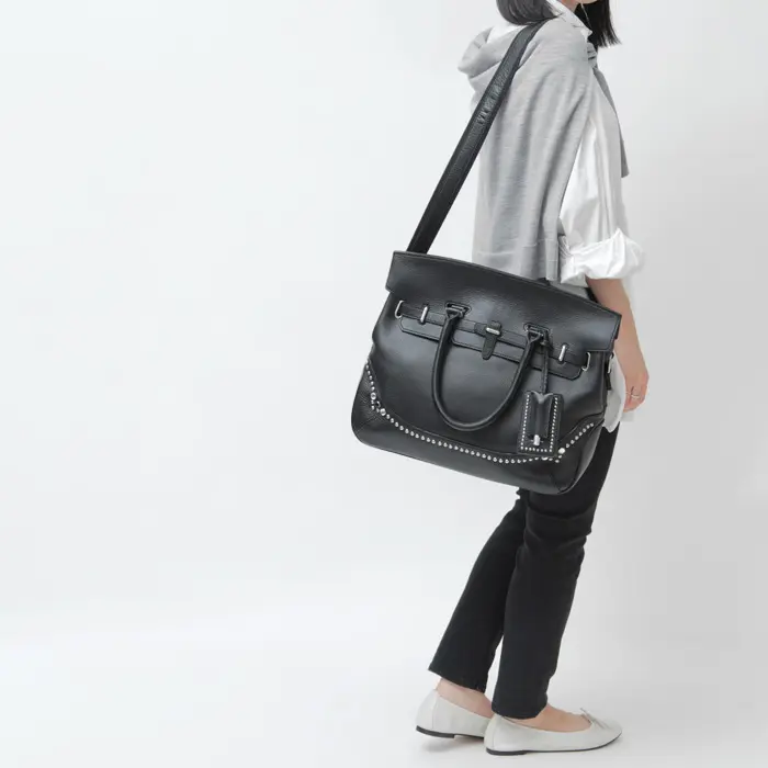 重厚感あるオールレザーの被せ付ボストンバッグ。アイコニックなスタッズが輝き、きちんと感と華やぎを併せ持った絶妙なバランスが、道具としてだけではない面白さや楽しさを表現しています。A4がゆったり入る大容量のサイズ感で、ビジネスシーンだけでなく、旅行やゴルフなどにもおすすめのバッグです。