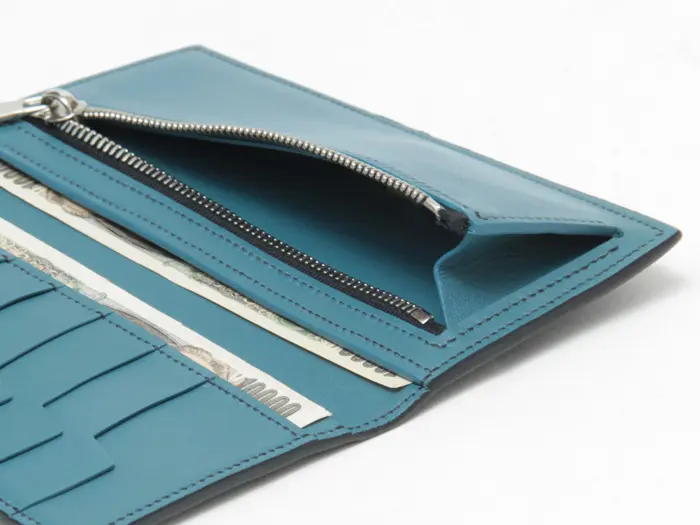 ササマチと呼ばれるV字型のマチを採用したコインケース付き。レザーに施されたカッティングで取り出しやすい5つのカードポケットと、1万円札が収まる1室の札入れ、カード入れ裏の2段スリットポケットを装備。見やすさと薄さを両立しながら、優れた収納力を持つ使いやすいデザインが特徴です。