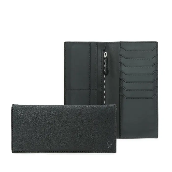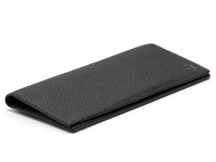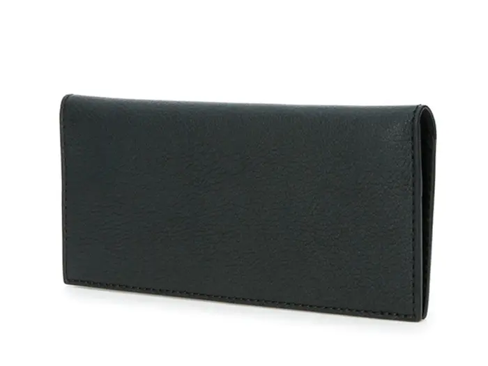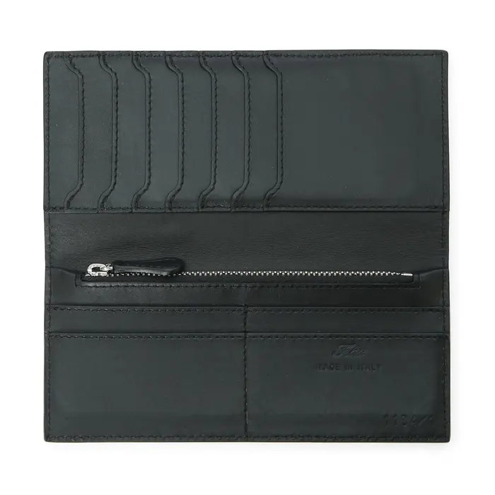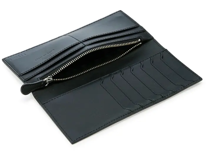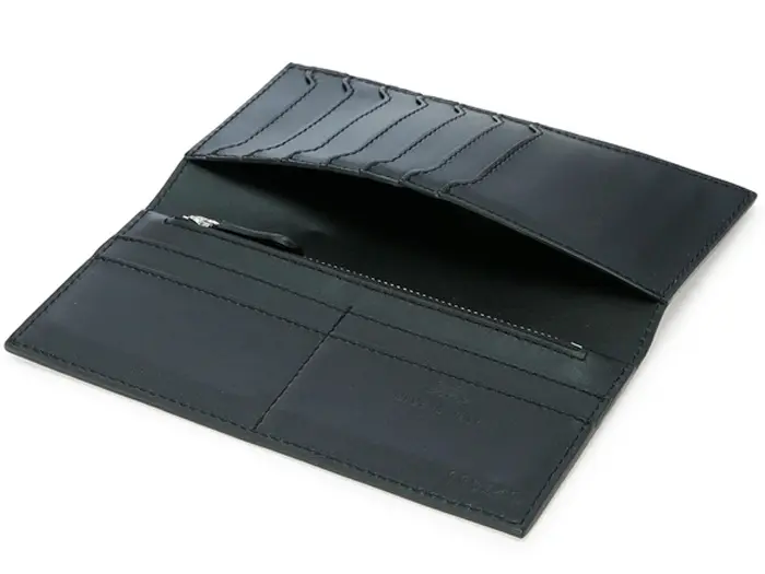 シンプルな二つ折りのロングウォレット。内側には11室のカードケースに、札入れが2室、ファスナー付きのコインポケットが1つと、スリムながらも大容量で収納力抜群です。スーツの内ポケットにいれてもシルエットが崩れにくいので、ビジネスシーンにもおすすめです。