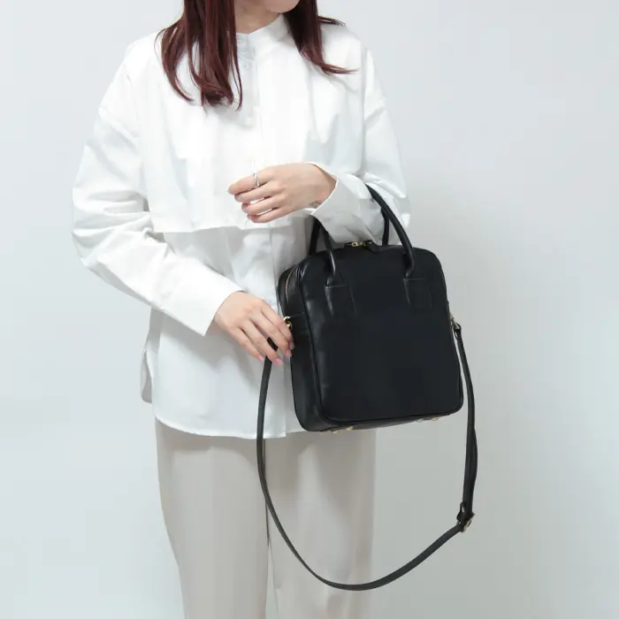 手提げバッグとして、ショルダーバッグとして持てる2way仕様。ストラップには本体とは異なるステアレザー(ヌメ)を使用。程よい厚みがあり、安定感のある持ち心地。ストラップは取り外しができ、外して持った時もスッキリとお持ちいただけます。