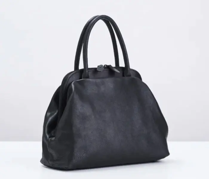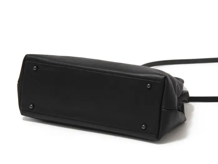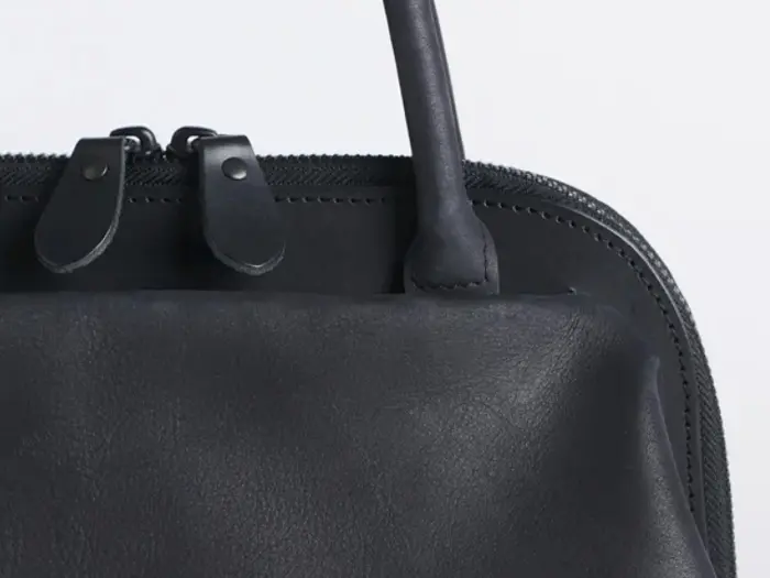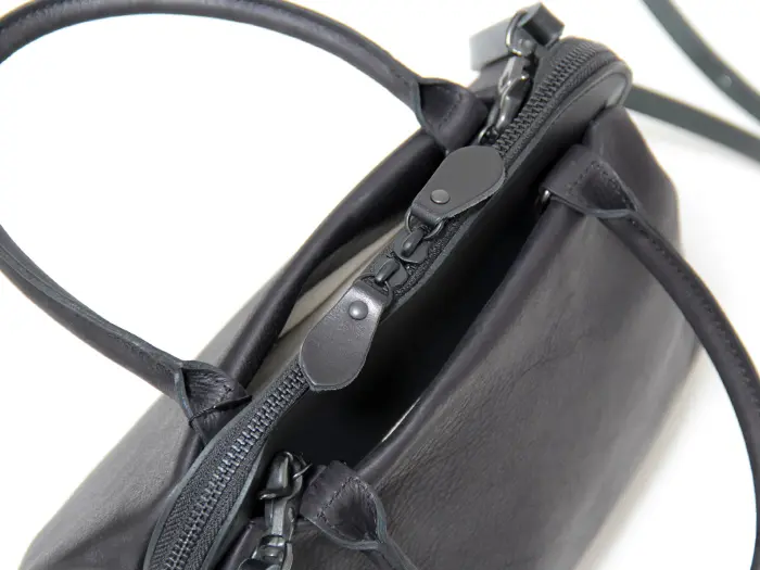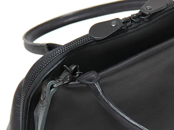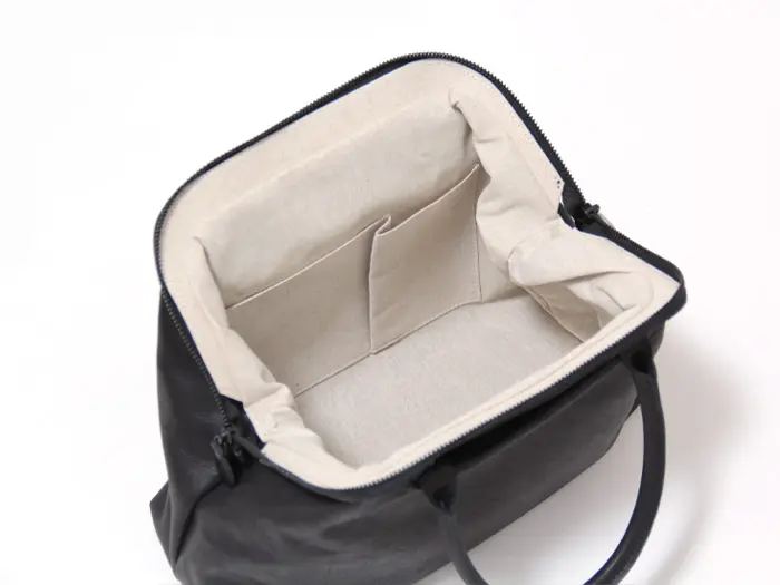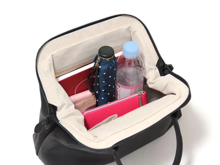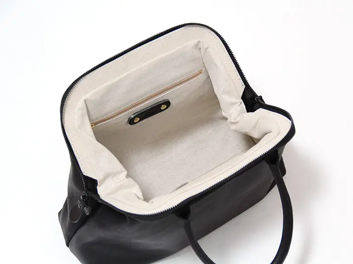 開閉はダブルファスナー仕様で、左右どちらからでも開けられます。B5サイズが収まる幅があり、マチが12cmあるのでお弁当やペットボトル、折り畳み傘なども入れていただけます。ぐるりと配したファスナーにより大きく開くので中の物が見やすく、お仕事やお出かけに、幅広く対応できます。