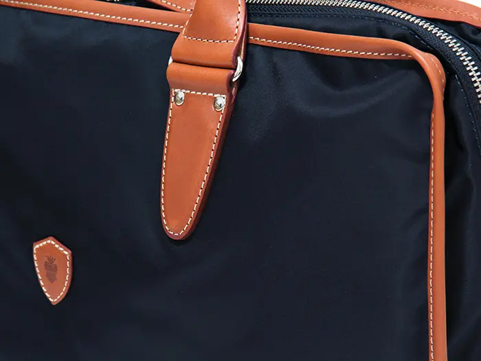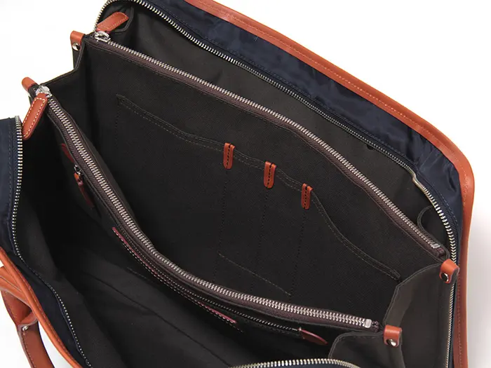 最高峰のナチュラルレザーのハンドルは、本革の質感と深みのあるカラーが高級感たっぷり。間口がサイドの下まで開くダブルジップ式になっており、荷物の出し入れがスマートに行えます。内装は中央の2つのポケットを間仕切りに3室構造。仕分け収納に優れ書類の整理もしやすく、中身も見やすい実用性を備えています。