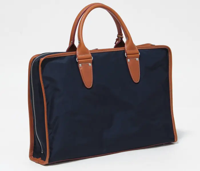 ドレッシーなナイロン素材を使用したA4サイズ対応の"Felisi/フェリージの"ブリーフバッグ。A4サイズの書類が横にすっぽりと入るサイズ感で、ビジネスシーンに最適。ナイロンとレザーの組み合わせが上品な印象を与え、メンズにもレディースにもお使いいただけます。エレガントさがありながらも、使いやすい生地を使用しデイリーからビジネスまで幅広くお使い頂ける逸品です。