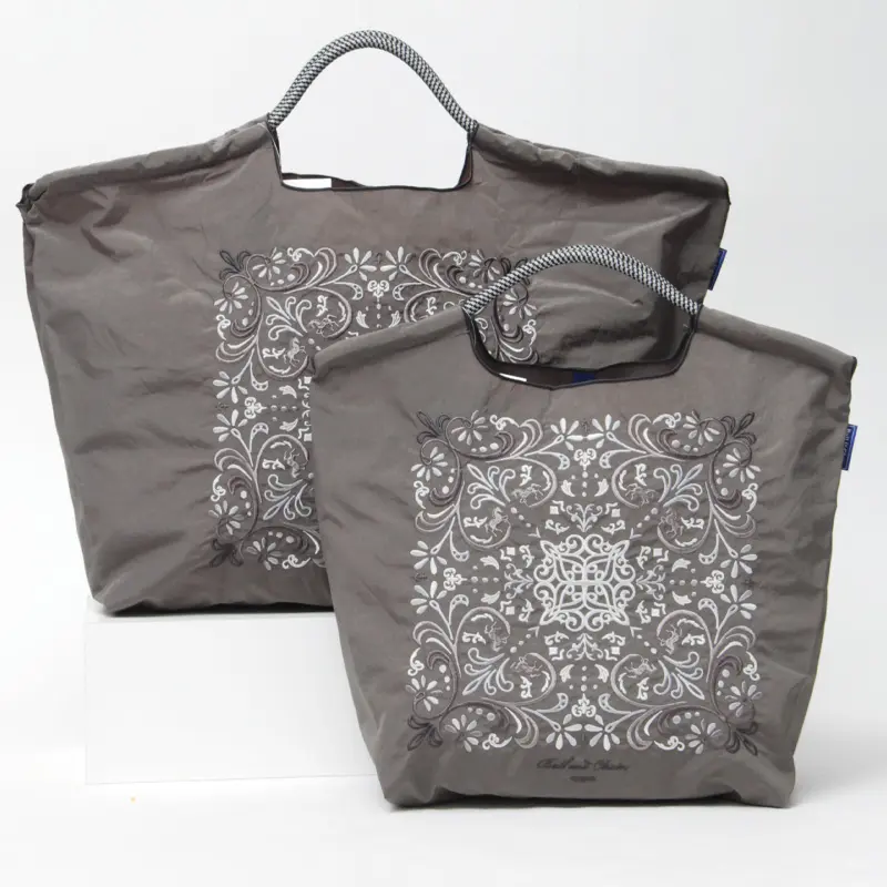 グラフィックデザインをそのまま刺繍で施すことで高級感がありデザイン性の高い仕上がりに。見た目だけでなく耐久性、撥水性に優れた厚手の素材を使用しているので、重い荷物の持ち運びも安心です。折りたたむと、手のひらほどのサイズになるのでコンパクトにしまえ、買い物への活用はもちろん、常に携帯しておけば外出中に急に荷物が増えた時などに対応でき、非常に便利なエコバッグです。エコなプレゼントとしても人気のアイテムです。
