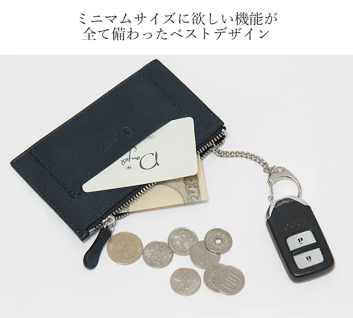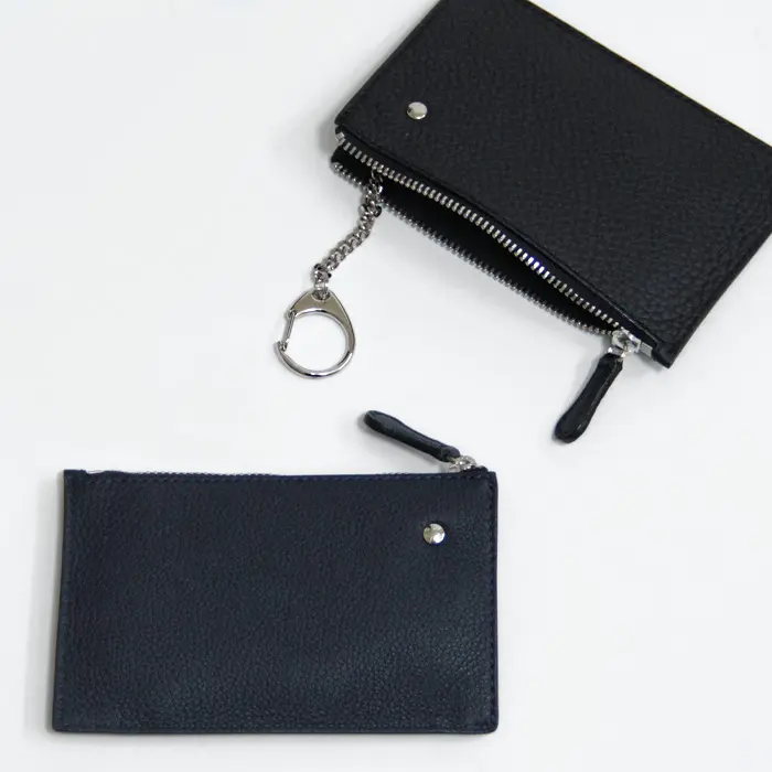 メインコンパートメントはシンプルな仕切りのない1室構造。開口部にはマチがあり、最大4cmまで開くので車のスマートキーも収納することができます。外側にはカードポケットがあり、ICカード等を入れるのに便利です。キーチェーンを外に出し、サコッシュ等のストラップ部分にセットするのもお薦めです。