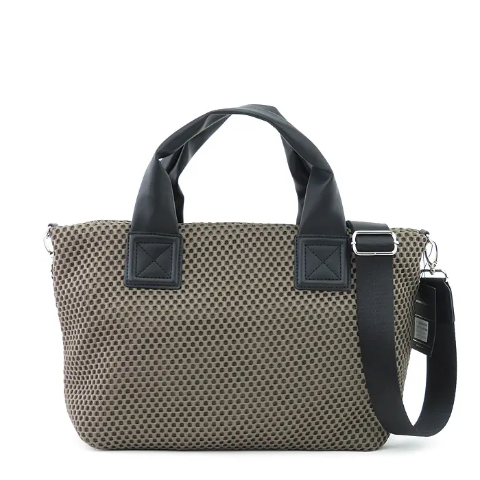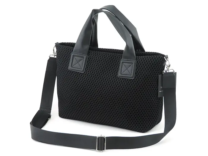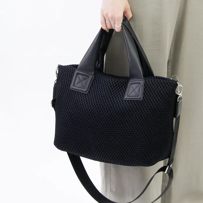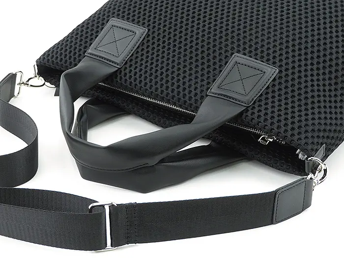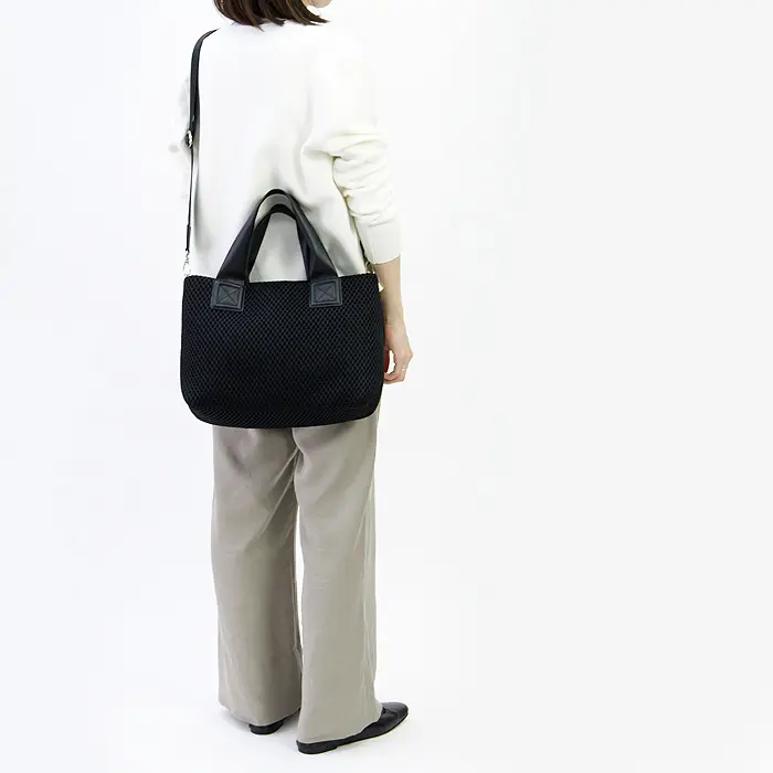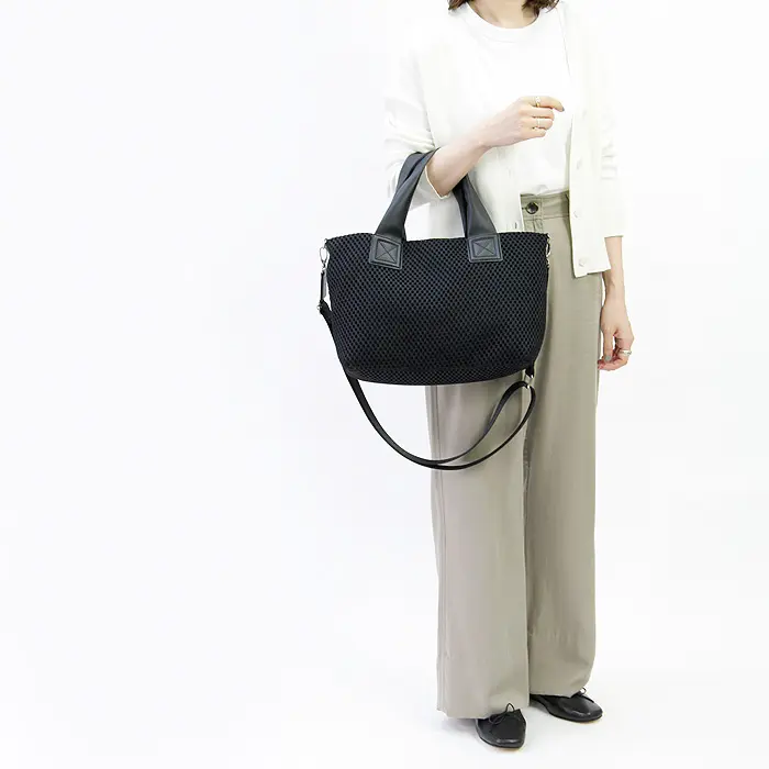 軽やかな表情のメッシュ生地は落ち着いたカラーで大人な仕上がり。とても軽いので、荷物をたくさん入れても安心してお持ちいただけます。ハンドルは合成皮革なので、雨の日も気にせずお持ちいただけます。