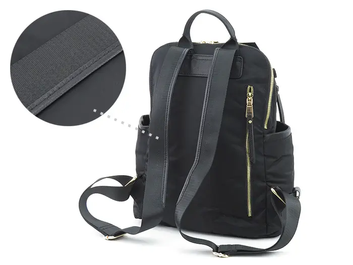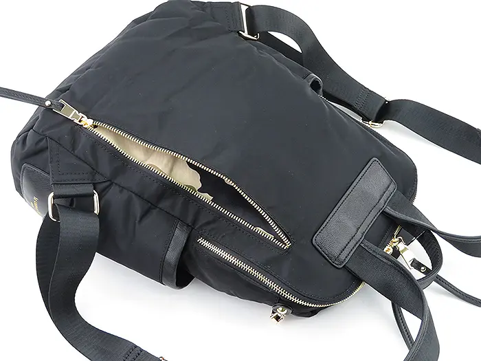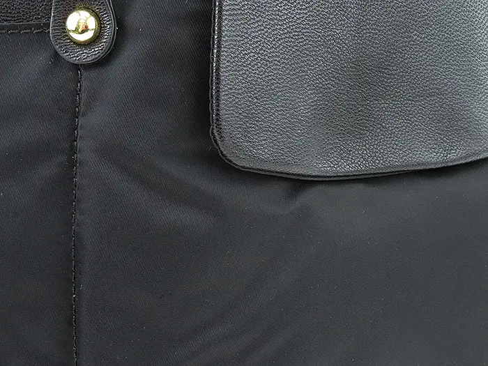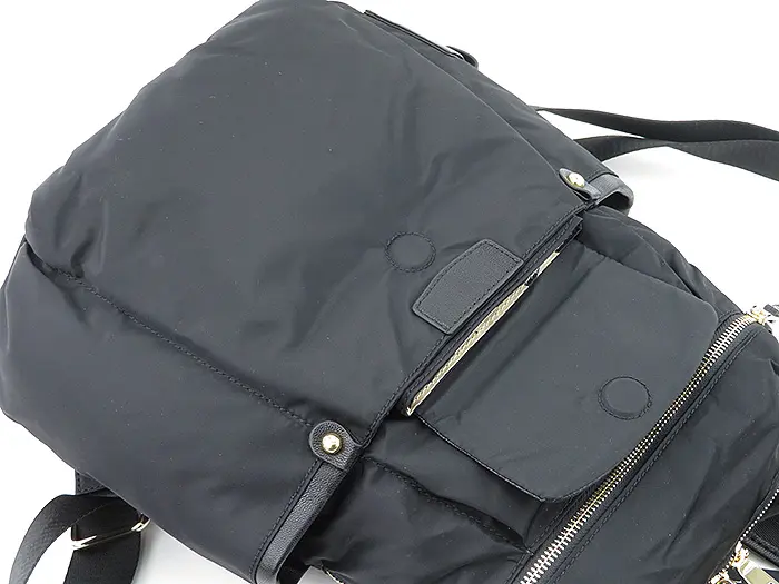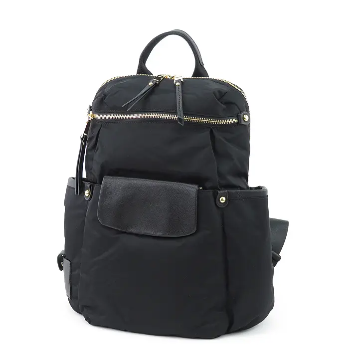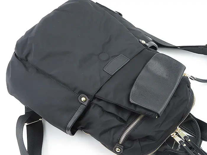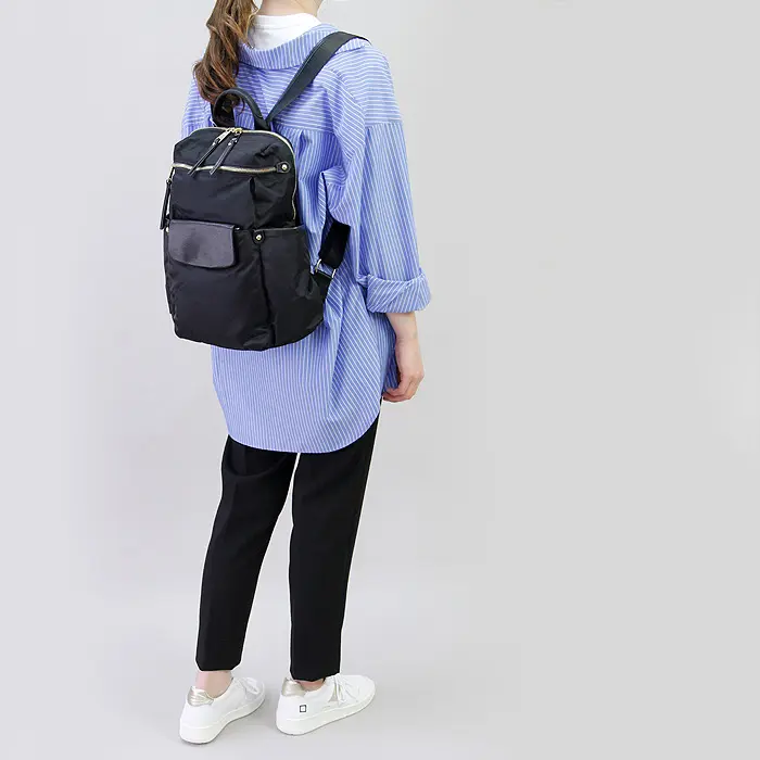 本体素材はナイロン100%。雨の日も安心してお持ちいただけます。ほんのり光沢感がありレザーや金具との組み合わせで上品に仕上がっているので、カジュアルもきれいめも相性抜群です。