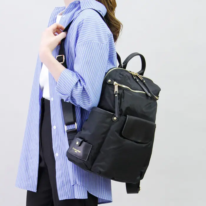 ほんのり光沢感のあるナイロン素材を使用した“le camouflage tribe ル カムフラージュ トライブ”のリュック。充実した収納で荷物の仕分けがしやすく、さらに取り外せるミニポシェット付きで便利にお使いいただけます。カジュアルになりがちなナイロンバッグもレザーや金具使いで品があり、きれいめにもぴったり。通勤やマザーズバッグ、旅行など幅広いシーンに活躍してくれます。