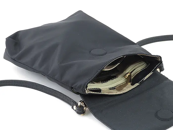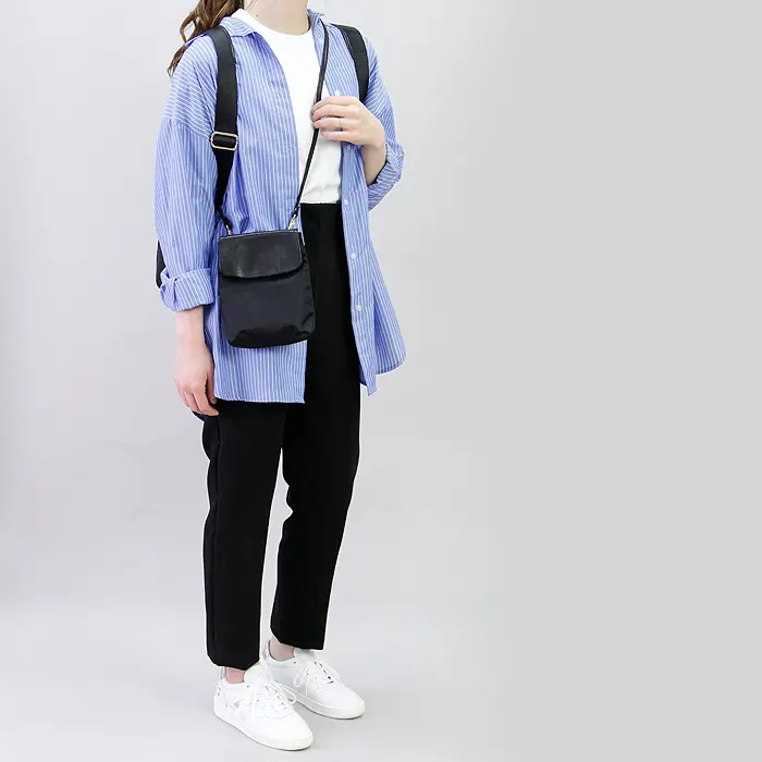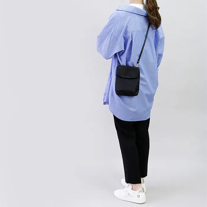 ミニ財布やスマホなど必要最小限の荷物が収まるコンパクトサイズ。貴重品を入れてリュックと一緒に持ったり、仕事のランチタイムや旅先でのちょっとそこまでのお出掛けならこれだけで十分です。ポケットやカード入れも付いており、便利にお使いいただけます。
