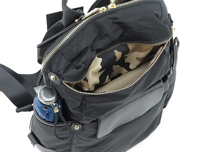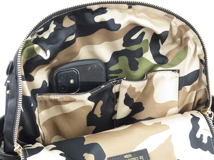 メイン収納の開閉はダブルファスナー仕様。左右どちらからでもスムーズに開けられます。裏地はカモフラージュ柄。バッグを開けたときにちらっと覗くカモフラ柄がお洒落です。