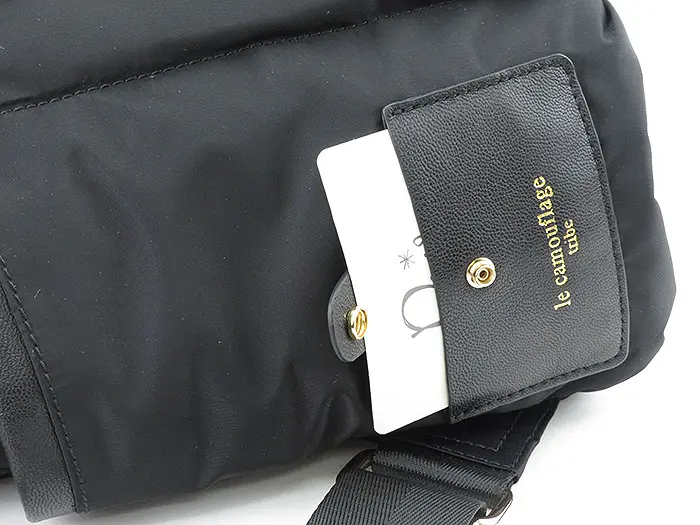 正面上部のファスナーポケットはお財布などを入れておくとすぐに取り出せて便利です。サイドのポケットは折り畳み傘やペットボトルが縦に入ります。片側にはICカードが入るカードポケット付きです。