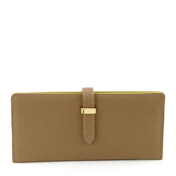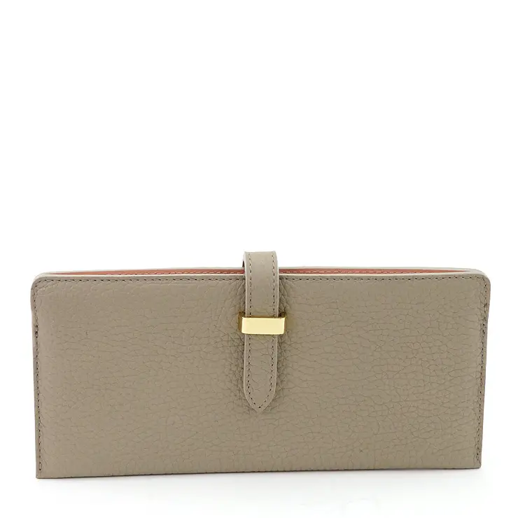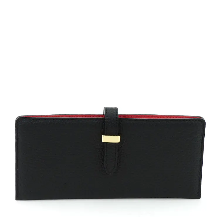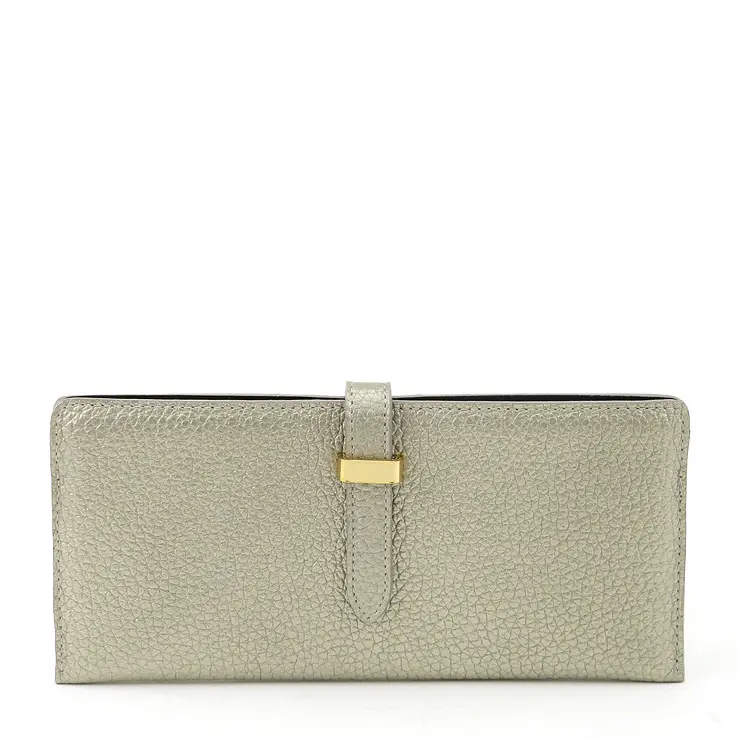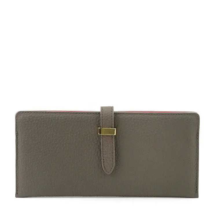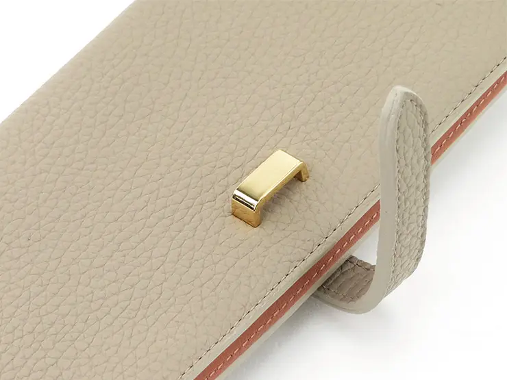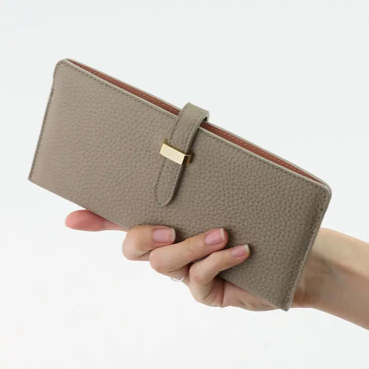 お財布をコンパクトに持ちたいけどお札は折りたくない!という方必見の薄い長財布。マチが薄いのでコンパクトに持つことができ、なおかつ、お金やカードを分けて収納できるスマートで機能的なデザインです。手触りの良い牛革は高級感があり、ゴールドの金具が上品さを漂わす大人の女性にピッタリなロングウォレットです。