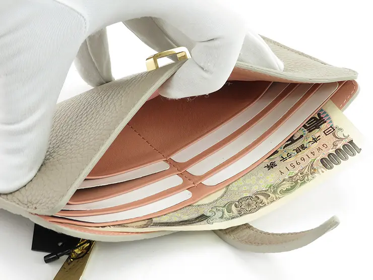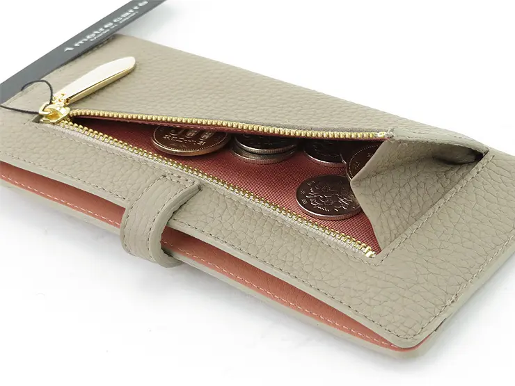 メイン収納はサイドにスリットが入っているのでスリムでもしっかり開きます。内側にカード入れが6ヶ所。1ヶ所に2枚は入るので10枚前後入れていただけます。カード入れ後ろのポケットはお札入れとして使用したり、レシートや領収書などの保管にもお使いいただけます。メイン収納にそのままお札を入れても◎