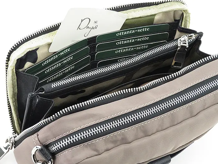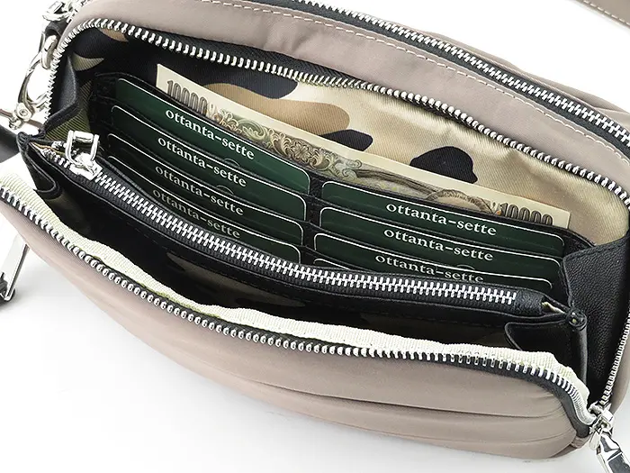 正面にお財布機能の収納があります。ダブルファスナー仕様なので、左右どちらからでも開けられます。