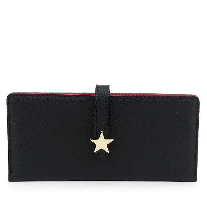 マットでシボを効かせた牛革は上質感漂い、ソフトな手触りです。内側には表とは異なった色を使われた、お洒落なバイカラーデザイン。フロントの星型のゴールド金具がシンプルなお財布に可愛さと上品さをプラスしてくれます。