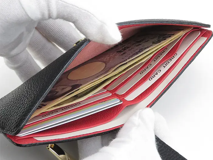 カード収納6か所、オープンポケット2ヶ所と仕分けもしやすい仕様です。裏地はポリエステル素材を使用することで、軽量化も考えられたデザインになっています。