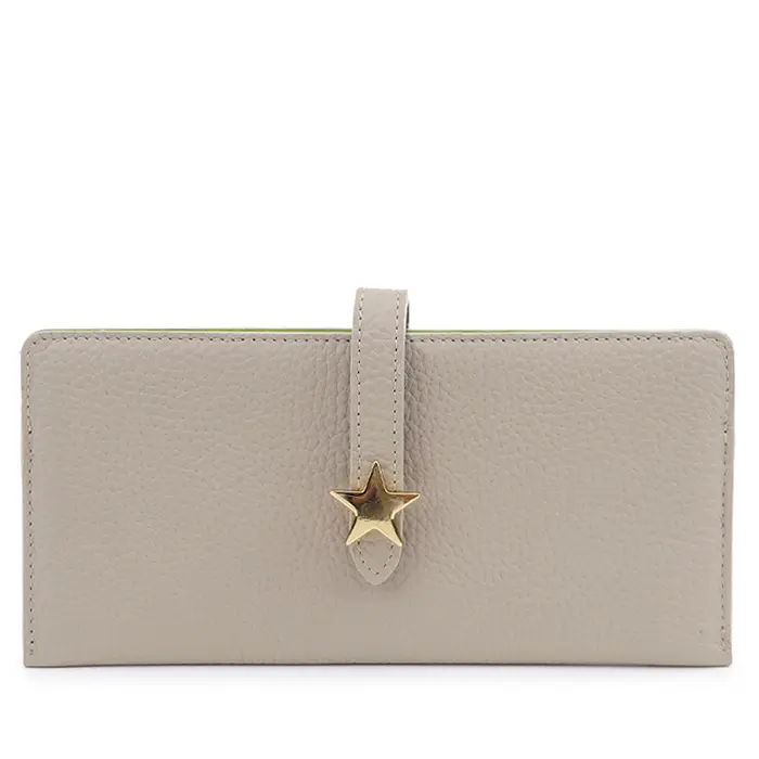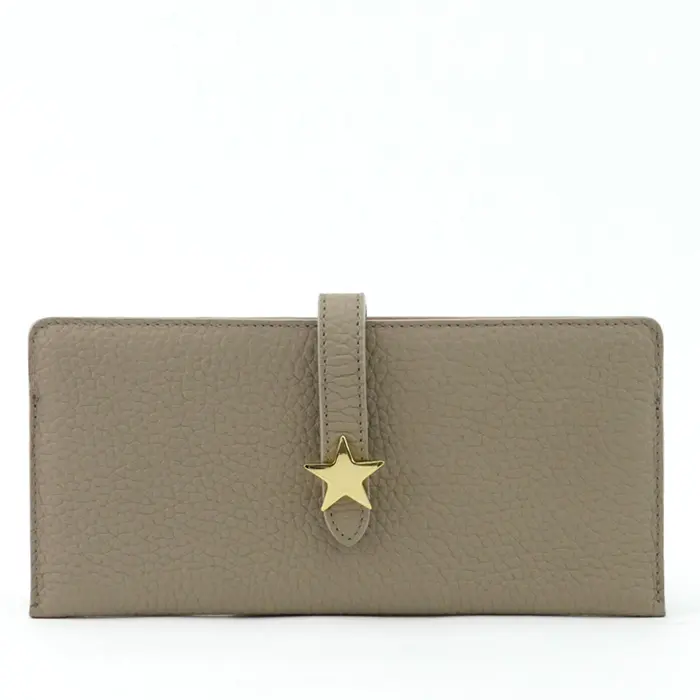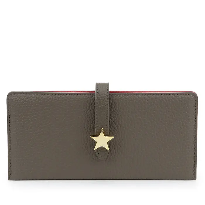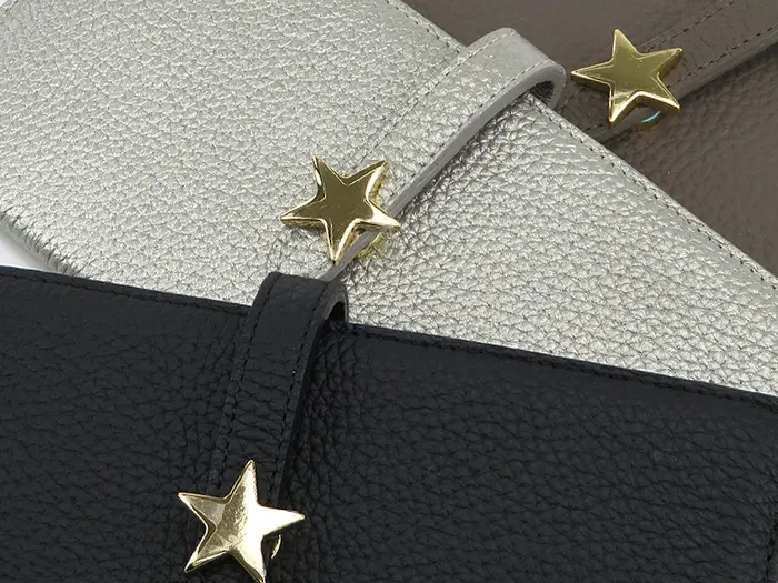 マットでシボを効かせた牛革は上質感漂い、ソフトな手触りです。内側には表とは異なった色を使われた、お洒落なバイカラーデザイン。フロントの星型のゴールド金具がシンプルなお財布に可愛さと上品さをプラスしてくれます。