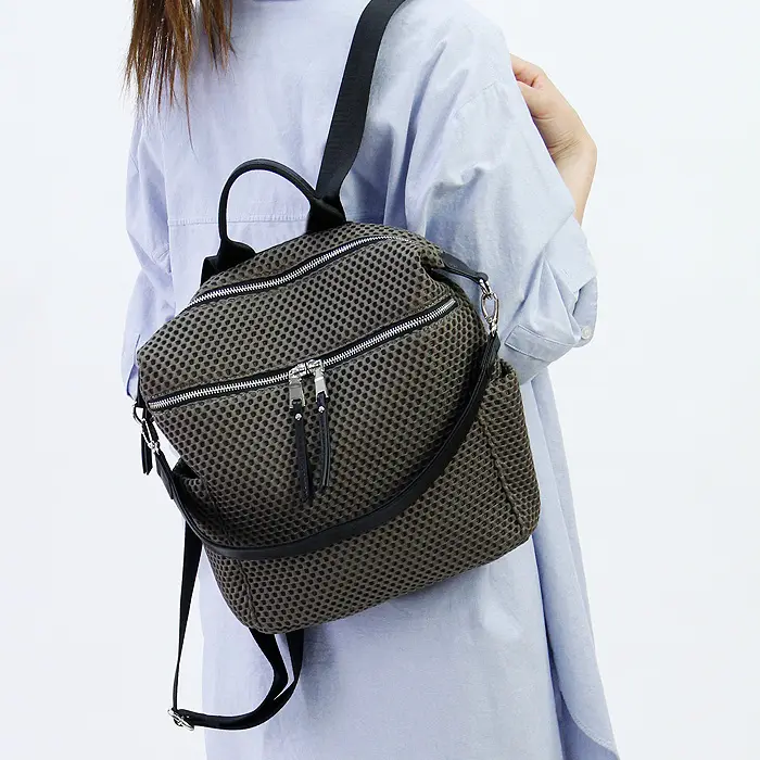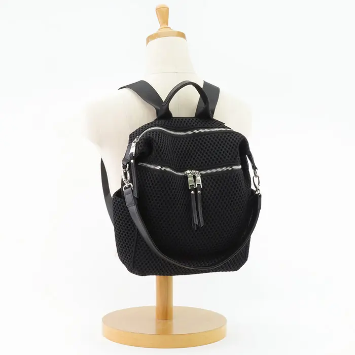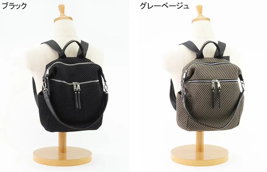 正面のファスナーポケットはよく使うスマホなどの収納に便利です。両サイドのオープンポケットは折り畳み傘などを入れていただけます。