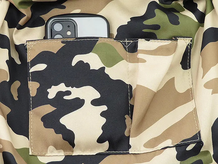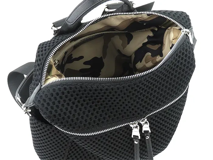 開閉はダブルファスナー仕様。左右どちらからでもスムーズに開けられます。裏地はカモフラージュ柄。バッグを開けたときにちらっと覗くカモフラ柄がお洒落です。