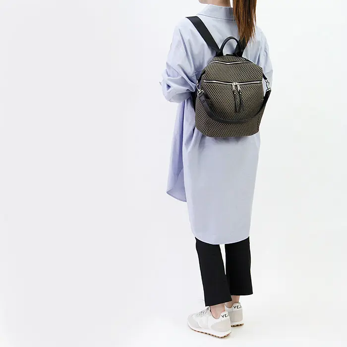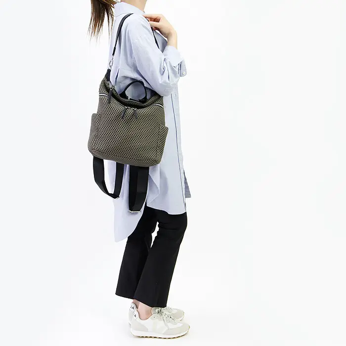 メッシュ素材を使用した軽やかな表情の“le camouflage tribe ル カムフラージュ トライブ”のリュック。大きすぎないコンパクトなサイズ感が上品かつ、素敵な後ろ姿を演出します。ストラップ付きでショルダーバッグにもなり、お洋服やシーンに合わせて持ち替えが可能です。きれいめにもカジュアルにも合うデザインと必需品+αが収まる大きさでオンオフに重宝します。