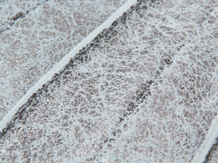 床面にクラックの箔加工を施し、ひび割れた粗い印象を表現したikotオリジナルのクラッキングレザー。見た目の印象とは対照的に、柔らかな肌触りが特徴です。使ううちに箔が徐々に剥がれ落ち、風合いの変化も楽しむことができます。銀面を内側に使用したことで裏生地が不要となり、その分「軽量」に仕上っているのも魅力です。