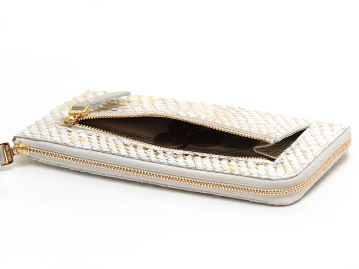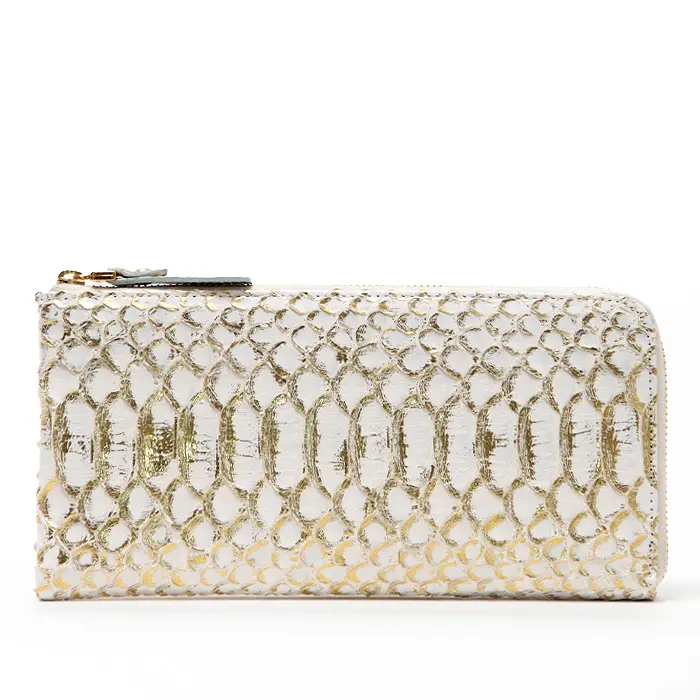 天然のパイソンレザーにゴールドの箔加工を施した"ドーレ"シリーズ。華やかなゴールドの財布は、バッグから取り出すたびに明るい気持ちになります。見た目の高級感だけでなく、本物の蛇革を使用した金運アップも期待できる縁起の良いサイフです。使い勝手の良さが魅力のL字ファスナー長財布。収納力がありながらもスマートに持てる薄型で、人気のデザインです。