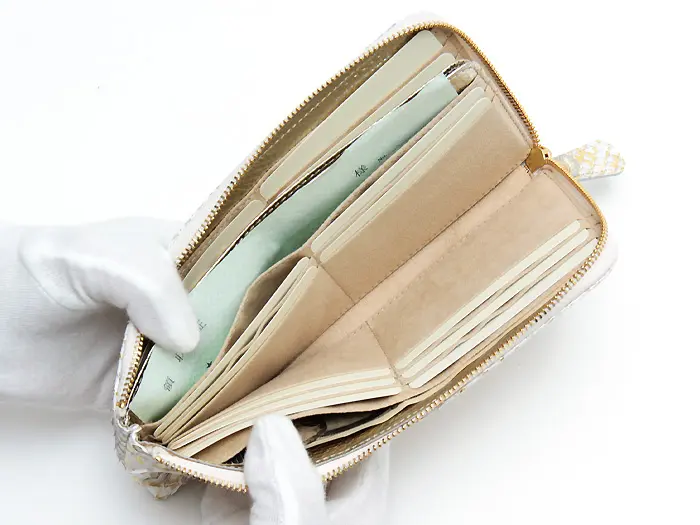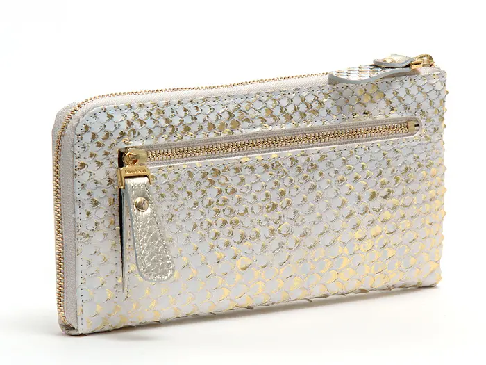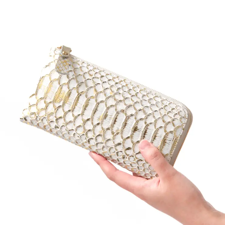 上品な箔が手元に華やぎを添えてくれる"ドーレ"シリーズは、パイソンレザーに箔加工を施したお財布です。光の当たり方で表情が変化するので、使っている間もラグジュアリー感が漂う大人の女性にオススメのお財布です。 蛇のウロコは一枚の革として繋がっているので剥がれることなく、丁寧に扱っていただければ長くご愛用いただけます。はじめは立体的なウロコの状態ですが、時間と共にウロコの反り具合が落ち着き、滑らかな手触りになっていきます。