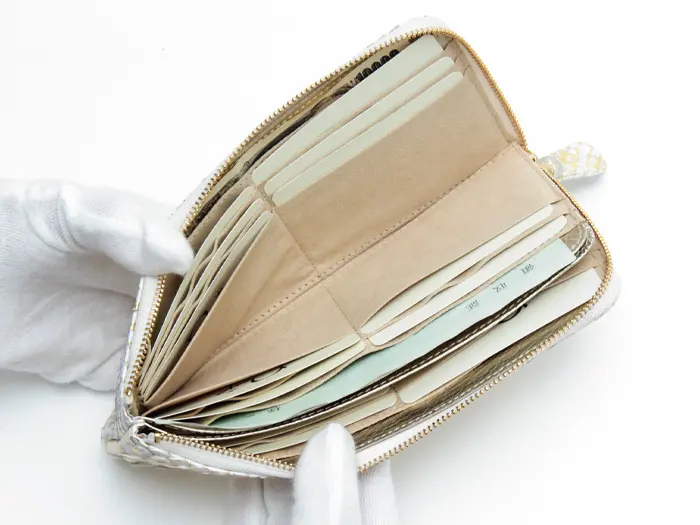 L字サイフはファスナーを開けると、お金やカードなど中身が一度に見えるのがポイントです。どこに何があるのかひと目で分かるので、お会計もスムーズです。たくさん入れてもファスナーを閉めればすっきりとした薄いフォルムで、バッグの中に入れてもかさばりません。