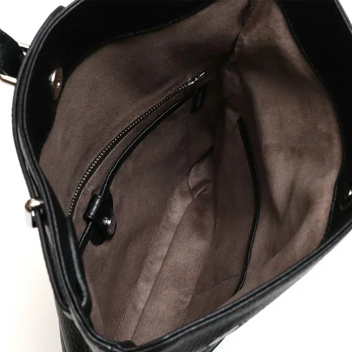 皮革の名産地・姫路松原地区で開発された、やわらかなシュリンクレザーを使用。丹念な鞣しとバタ振り加工で、美しいシボ感と上品な風合いを実現しました。芯通し染色により深みのあるカラーを表現し、軽いアイロン仕上げで自然な艶を調整。約40日をかけて丁寧に仕上げた日本製レザーです。内装には手触りの良いマイクロライトスエードを採用し、金具にはスーパーホワイト加工を施して上品な輝きを添えています。