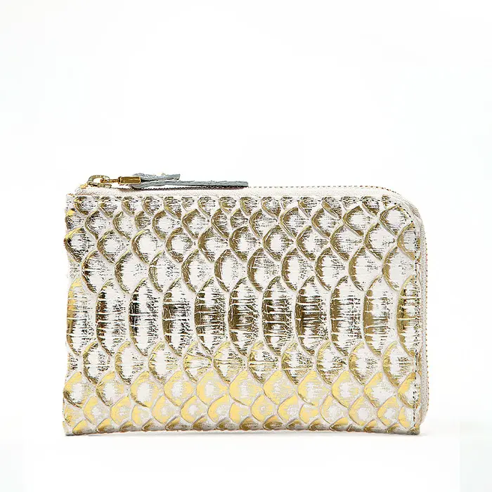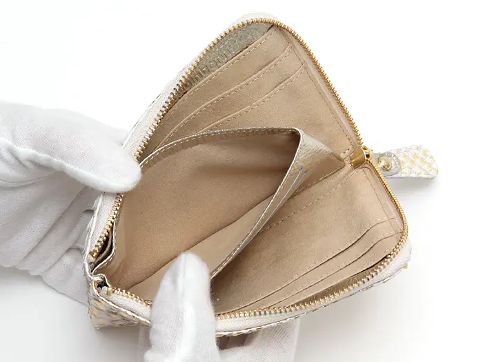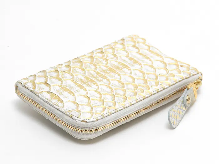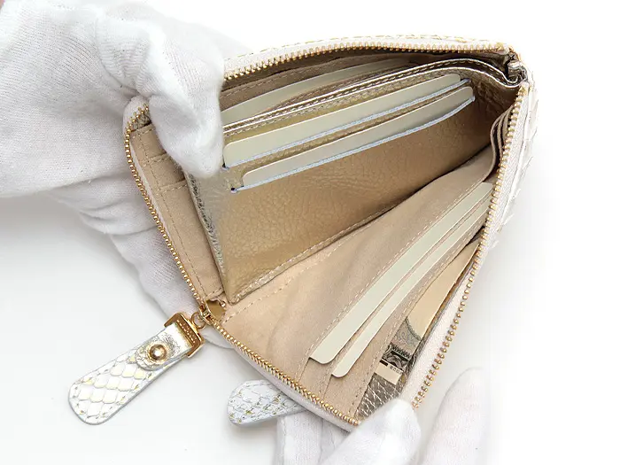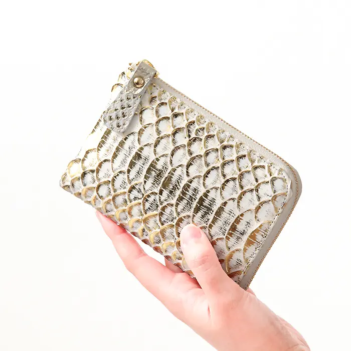 上品な箔が手元に華やぎを添えてくれる"ドーレ"シリーズは、パイソンレザーに箔加工を施したお財布です。光の当たり方で表情が変化するので、使っている間もラグジュアリー感が漂う大人の女性にオススメのお財布です。 蛇のウロコは一枚の革として繋がっているので剥がれることなく、丁寧に扱っていただければ長くご愛用いただけます。はじめは立体的なウロコの状態ですが、時間と共にウロコの反り具合が落ち着き、滑らかな手触りになっていきます。