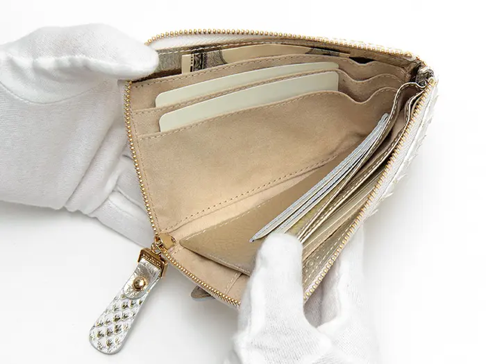 L字サイフはファスナーを開けると、お金やカードなど中身が一度に見えるのがポイントです。どこに何があるのかひと目で分かるので、お会計もスムーズです。たくさん入れてもファスナーを閉めればすっきりとした薄いフォルムで、バッグの中に入れてもかさばりません。