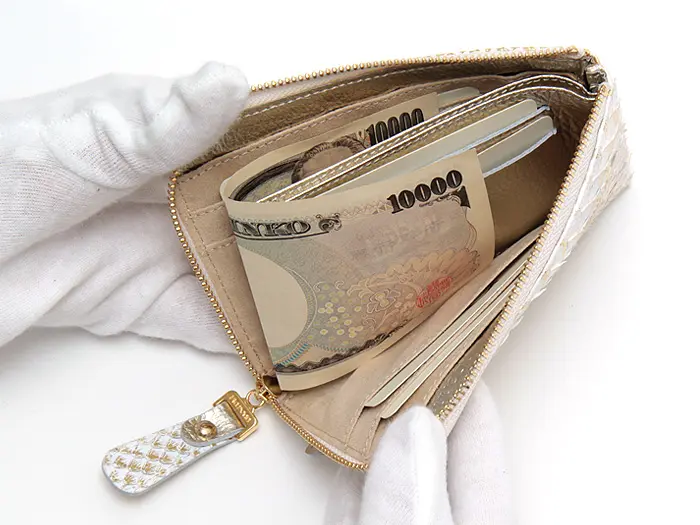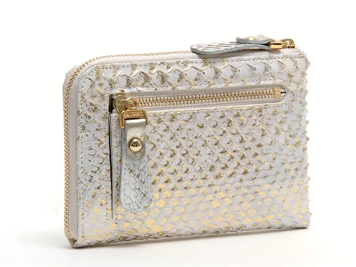 天然のパイソンレザーにゴールドの箔加工を施した"ドーレ"シリーズ。華やかなゴールドの財布は、バッグから取り出すたびに明るい気持ちになります。見た目の高級感だけでなく、本物の蛇革を使用した金運アップも期待できる縁起の良いサイフです。使い勝手の良さが魅力のL字ファスナー財布は、収納力がありながらも機能的でスマートに持てる人気のデザインです。