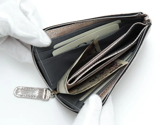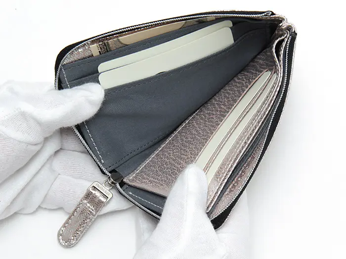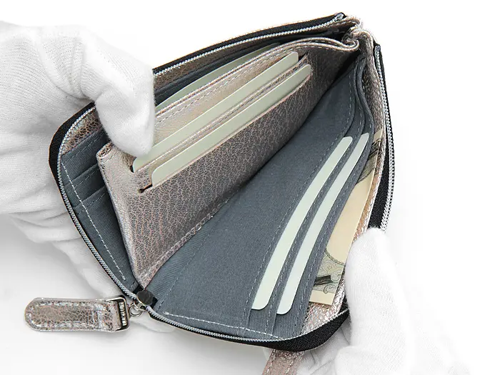 L字サイフはファスナーを開けると、お金やカードなど中身が一度に見えるのがポイントです。どこに何があるのかひと目で分かるので、お会計もスムーズです。たくさん入れてもファスナーを閉めればすっきりとした薄いフォルムで、バッグの中に入れてもかさばりません。