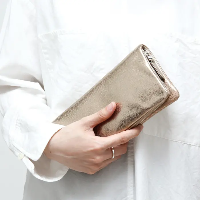 金運以外にも仕事運などが期待出来るゴールドとシルバーのお財布には、山羊革を使用。型崩れしにくい柔軟性に富んだゴートレザーは、丈夫で軽量なのがポイント。ベージュの下地にメタリックカラーを重ねることで、高級感溢れる風合いをお楽しみいただけます。
