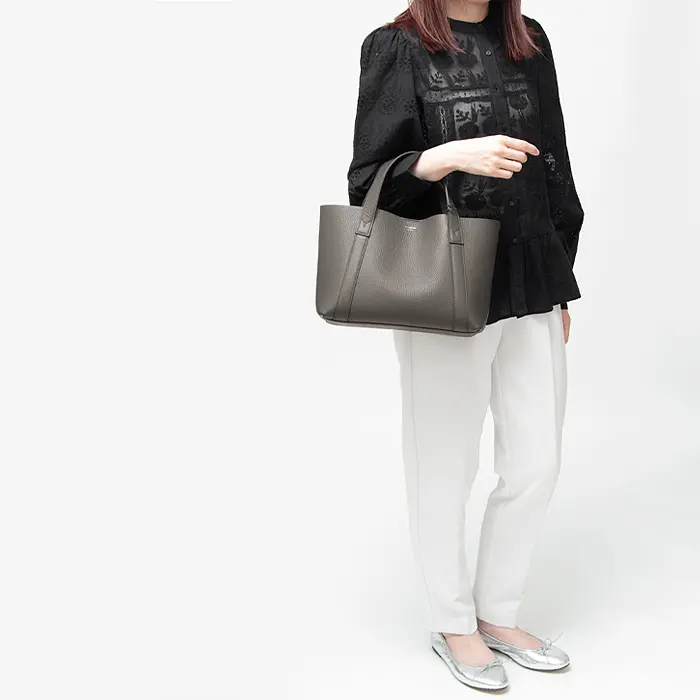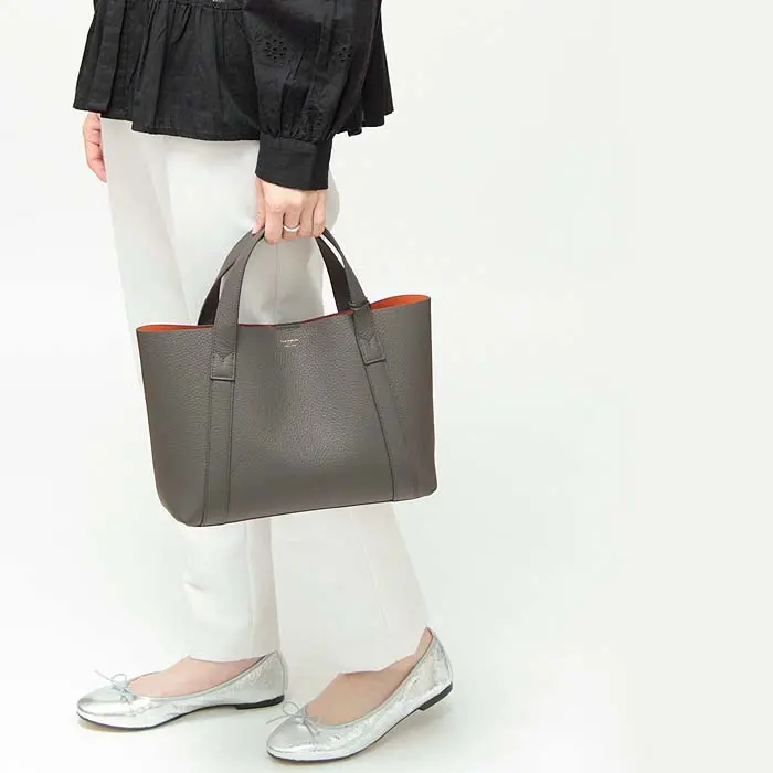 柔らかな風合いのダブルフェイスレザーを使用したミニトートバッグ。一枚仕立てのダブルフェイスレザーは裏地、芯地をほぼ使わず柔らかな仕上がりに。皮革生産地である姫路松原地区の牛革に、細やかなシボ型を押した上質なシュリンク風レザーに仕上がっています。