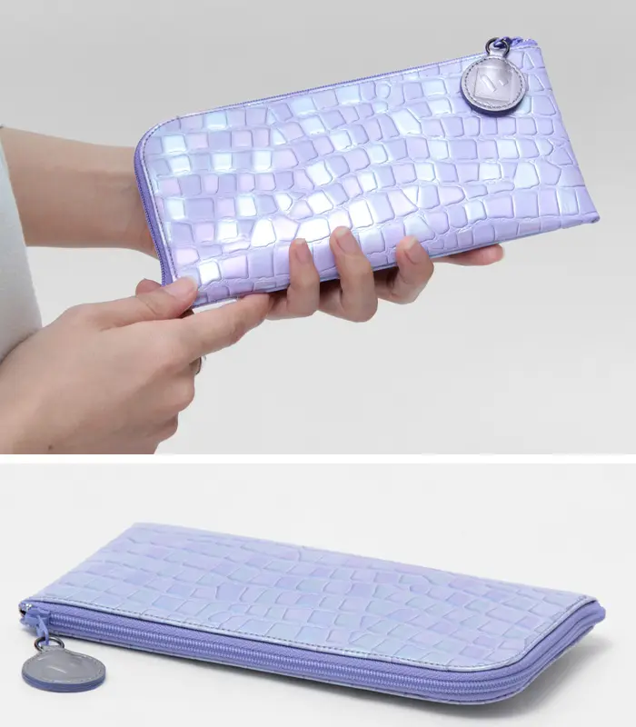 パール加工を施したクロコ型押しの牛革を採用。宝石のような透明感と、水彩画のように滲むグラデーションの淡いコンビネーションが魅力です。クロコ型押しの凹凸が光を受けるたびに表情を変え、色彩豊かで華やかな輝きを放ちます。新鮮で洗練されたデザインが、手元に華やぎを添えてくれるお財布です。