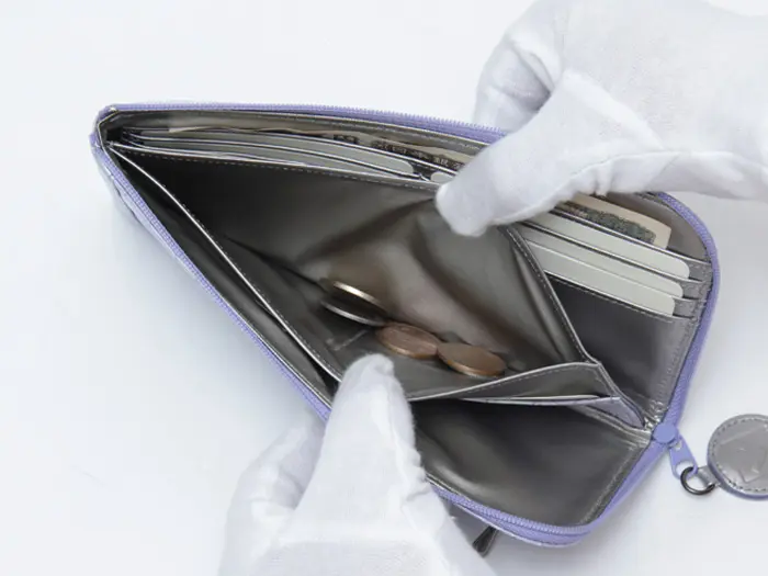 ファスナーを開けると、お札・小銭・カードが一目で確認できる設計。お会計時に必要なものがすぐに取り出せるため、スムーズでスマートな支払いが可能です。