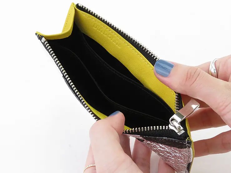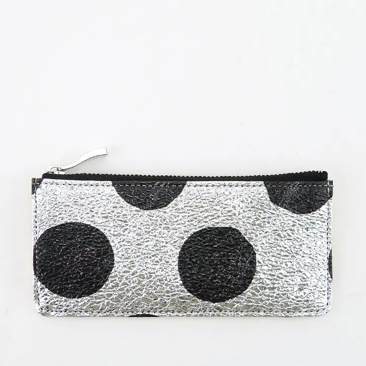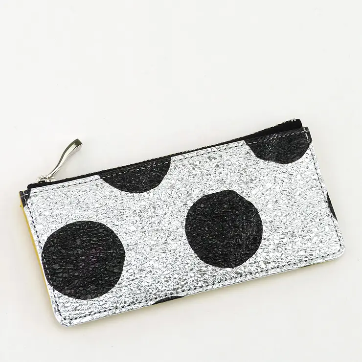 シルバー箔を加工した豚革にドットをプリントしています。背面は差し色に黄色の牛革。シルバー箔に合わせて金具はシルバー、ドットに合わせてファスナーテープと裏地のナイロンをブラックに統一することで、派手さの中にも落ち着きのある雰囲気を持ち合わせています。