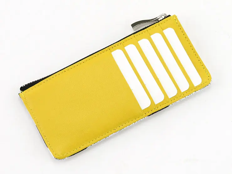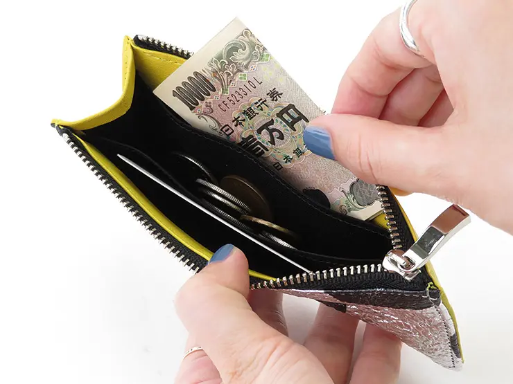 開閉はファスナー仕様。内側のカードポケットは免許証や保険証など個人情報系のカードを入れておくと安心です。お札は三つ折りで収納可能。メイン収納には小銭を入れていただけます。