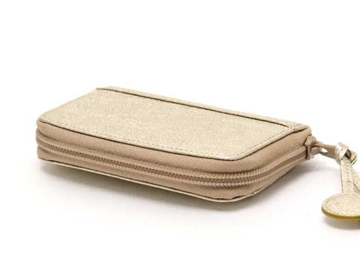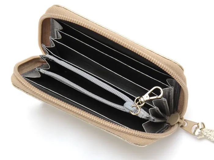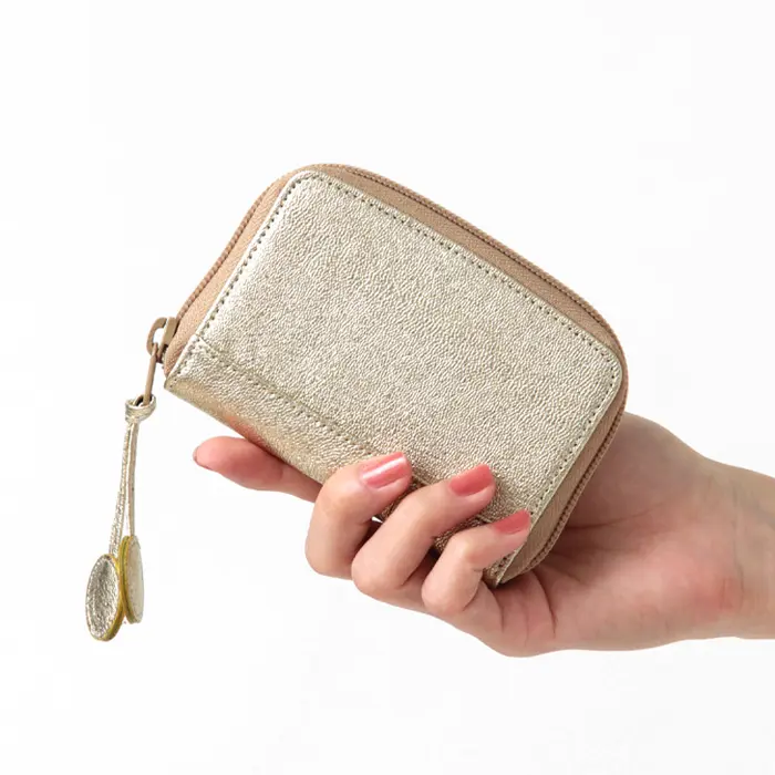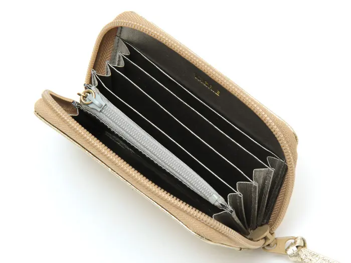女性の片手にも収まるコンパクトなカードケース。開閉はラウンドファスナー仕様です。7ヶ所あるカード入れは、蛇腹式で大きく開き、中身が見やすく取り出しやすいデザインです。お札は四つ折りに折りたたんで収納が可能です。