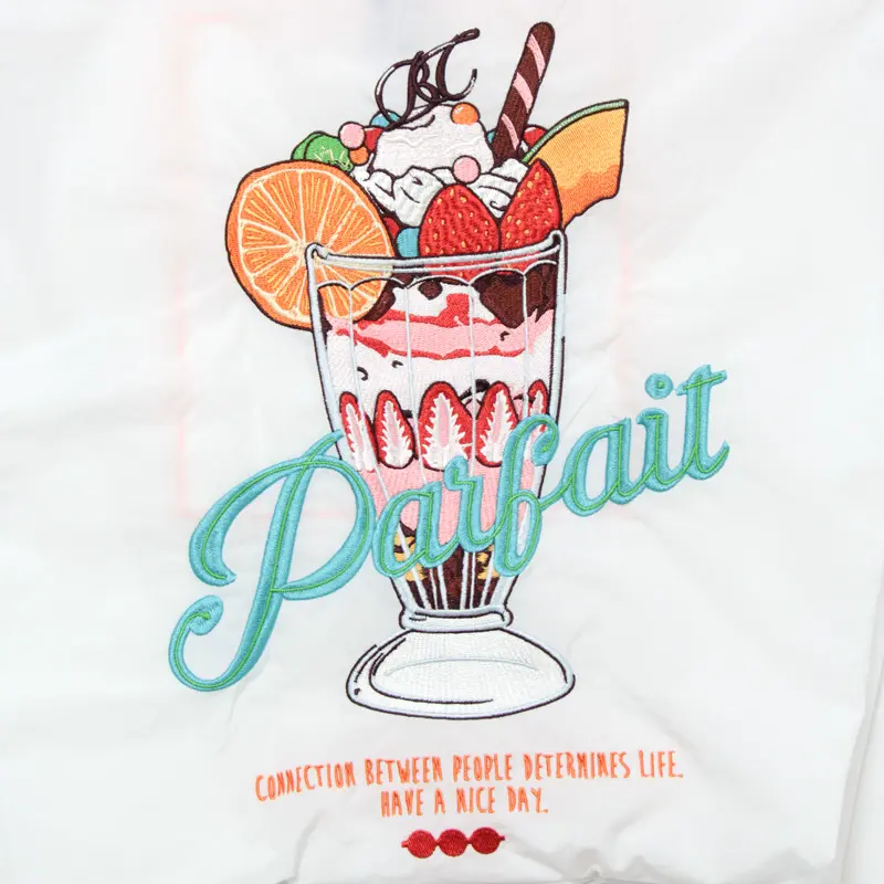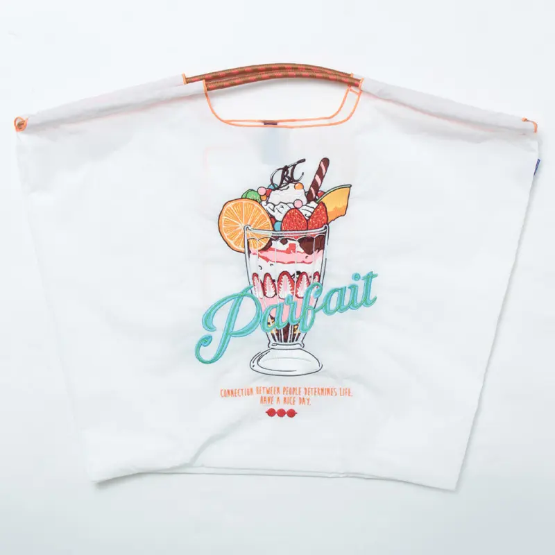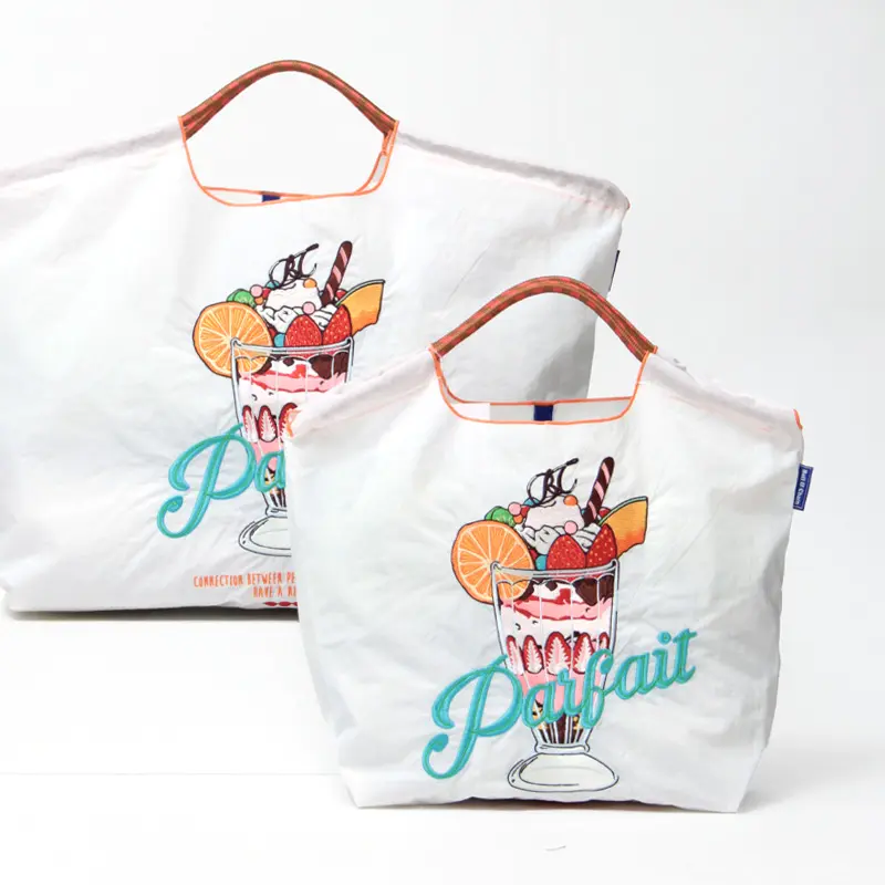 ホワイトのナイロンバッグは、明るく爽やかで清潔感があり、カラフルな刺繍が際立ちます。色とりどりのフルーツやトッピングは、刺繍ならではの立体感で表現されており、日常のコーデに楽しいアクセントをプラスするエコバッグです。