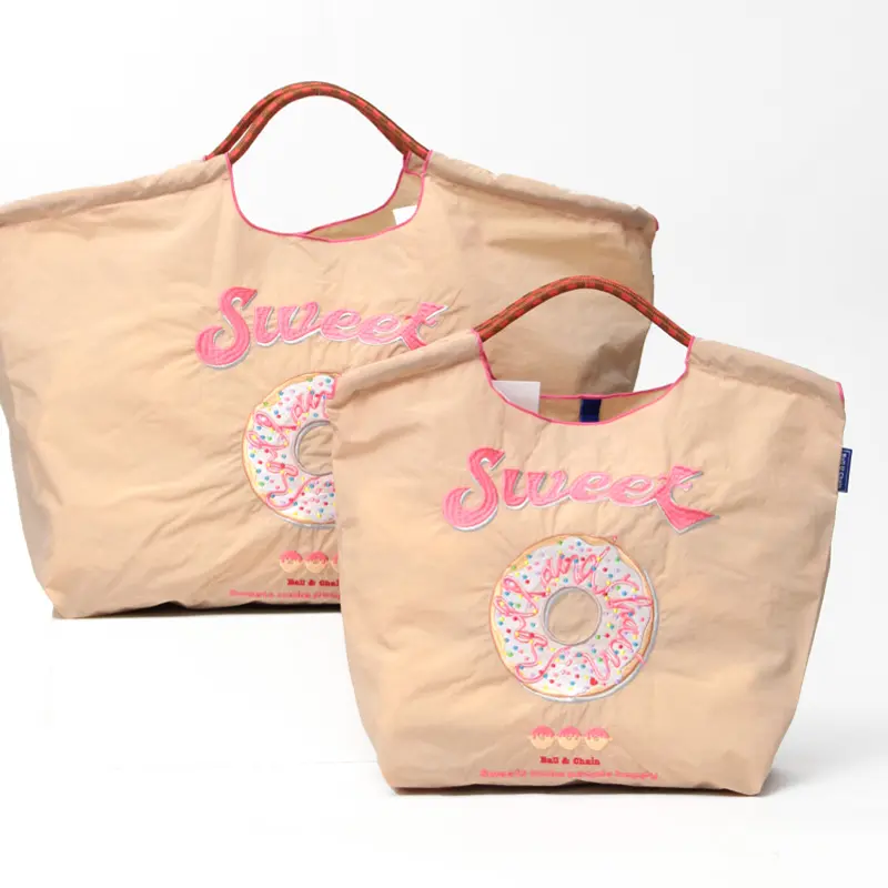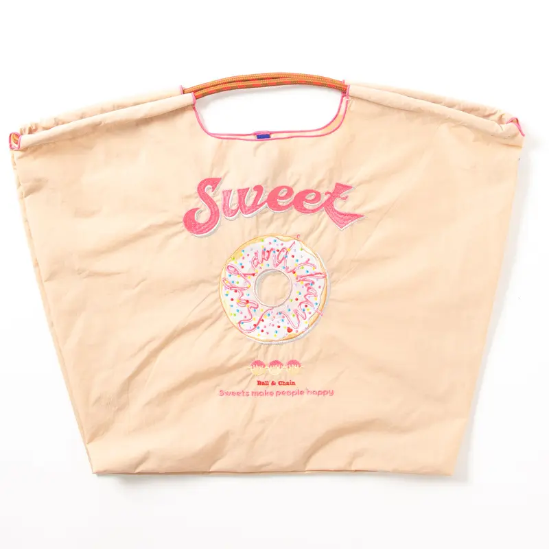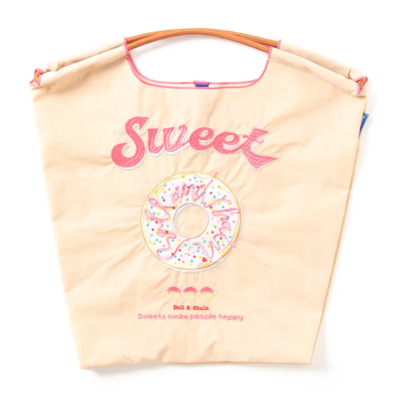 ベージュのナイロンバッグは、ナチュラルでやさしい印象で、フェミニンなコーデにもマッチします。ドーナッツのトッピングがさりげないアクセントとなり、全体をより可愛らしく演出。ポップでキュートなスイーツ柄に、立体的なドーナツトッピングを組み合わせた、見ているだけでもワクワクするエコバッグです。
